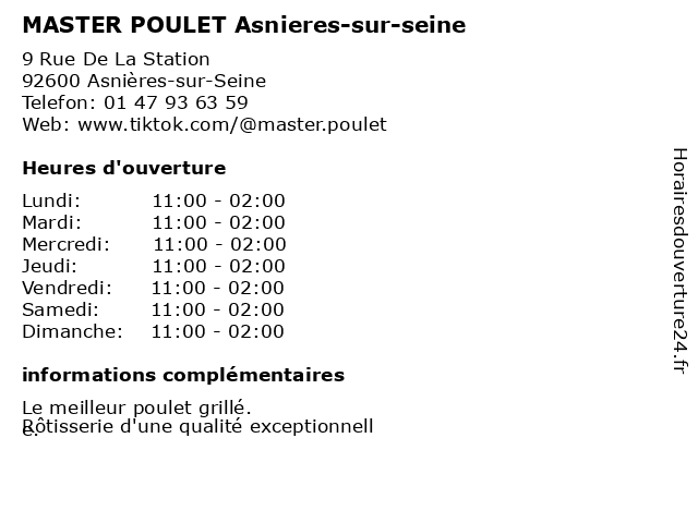 Termes de recherche pour MASTER POULET Asnieres-sur-seine:sur, asnieres, seine, restaurants, master, fast-food, poulet, service de livraison de restaurant, restaurant de grillades |