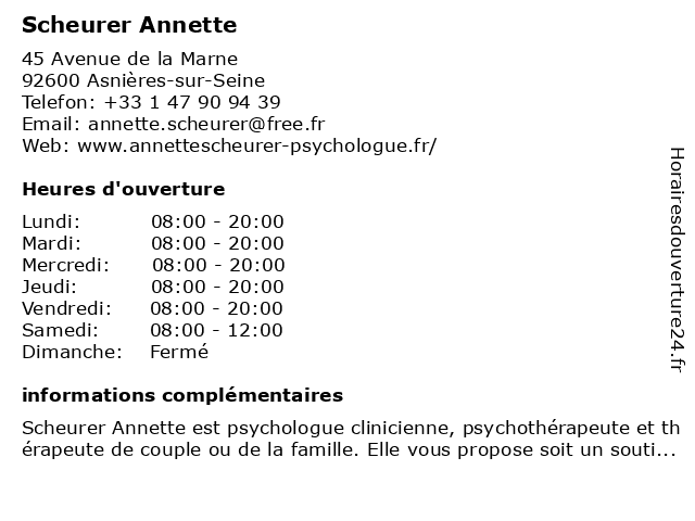 1 Maître Natacha Scheurer - Avocat (Distance: 3,65 km) 2 square de l’avenue du Bois, 75116 Paris avocat, avocats, cabinet, conseils, contentieux, juridique, justice, litiges, maître, natacha, scheurer, services 2 Amorim Antonio Et Sperlein Annette (Distance: 6,53 km) 244 Boulevard De La Villette, 75019 Paris amorim, annette, antonio, restaurants, sperlein 3 Charlène Scheurer - Pédicure-podologue (Distance: 7,10 km) 23 Boulevard Saint-Martin, 75003 Paris charlène, dr, medical, podologue, pédicure, scheurer, secrétariat 4 Dr Annette Gueguen - Gynécologue médicale et obstétrique (Distance: 10,41 km) 74 Rue Jules Guesde, 92240 Malakoff annette, consultation, docteur, dr, et, gueguen, gynécologue, med, médecin, médecine, médicale, obstétrique, traitement 5 Dr. Lesaing-Texier Annette - Pedo Psychiatre (Distance: 11,09 km) 4 Rue Santerre, 75012 Paris annette, docteur, dr., lesaing, medecins, pedo, psychiatre, sante, texier 6 Dr. Annette Gliksman - Psychopraticienne (Distance: 11,09 km) 4 Rue Santerre, 75012 Paris annette, clinicienne, de, denis, diderot, diplômée, docteur, dr., gliksman, l'université, medecins, paris, psychologue, psychopraticienne, psychothérapeute, sante, vii |
