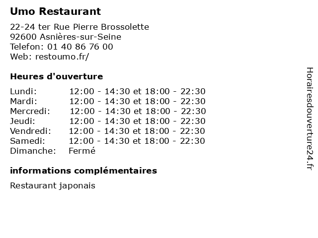 | Mardi | 12:00-14:30 et 18:00-22:30 |