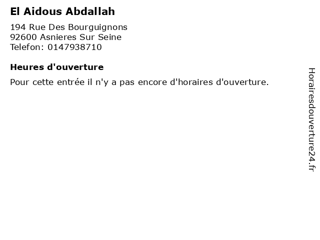 1 El Aidous Najib (Distance: 0,00 km) 194 Rue Des Bourguignons, 92600 Asnieres Sur Seine aidous, boucheries, najib, poissonneries 2 Audexi Expertise Comptable: Omar El Morabit (Distance: 0,68 km) 1 bis Rue Albert 1er, 92600 Asnières-sur-Seine audexi, comptabilité, comptable, el, expert-comptable, expertise, morabit, omar, service 3 El Ganso (Distance: 6,29 km) 40 Boulevard Haussmann, 75009 Paris clothings, dresses, el, ganso, stores 6 El guacamole (Distance: 7,98 km) 37 Rue Yves Toudic, 75010 Paris el, food, guacamole, restaurant, taco |
