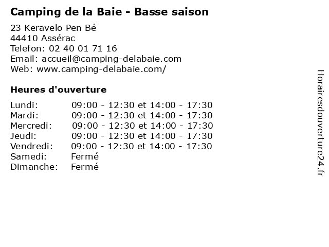 1 Camping de la Baie - Épicerie - Juillet et Août (Distance: 0,00 km) 23 Route de Keravelo Pen Bé, 44410 Assérac août, baie, camping, caravaning, de, en, et, juillet, la, loisirs, tourisme, vacances, épicerie 2 Camping de la Baie - Épicerie - Hors saison (Distance: 0,00 km) 23 Route de Keravelo Pen Bé, 44410 Assérac baie, camping, caravaning, de, hors, la, loisirs, saison, tourisme, vacances, épicerie 3 Camping de la Baie - Juillet et Août (Distance: 0,00 km) 23 Keravelo Pen Bé, 44410 Assérac accueil, août, baie, camping, caravaning, de, en, et, juillet, la, loisirs, tourisme, vacances 4 Camping L'Etoile de Mer - Basse saison (Distance: 0,89 km) 1 Route du Creno - Pen Bé, 44410 Assérac basse, camping, caravaning, de, en, l'etoile, loisirs, mer, réception, saison, tourisme, vacances 5 Camping L'Etoile de Mer - Haute saison (Distance: 0,89 km) 1 Route du Creno - Pen Bé, 44410 Assérac camping, caravaning, de, en, haute, l'etoile, loisirs, mer, réception, saison, tourisme, vacances 6 Camping Le Welcome (Distance: 2,56 km) 941 route de Bel Air, 44420 Mesquer camping, caravaning, le, loisirs, tourisme, vacances, welcome |