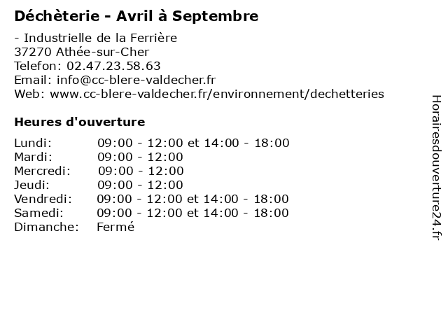 1 Déchèterie - Octobre à Mars (Distance: 0,00 km) - Industrielle de la Ferrière, 37270 Athée-sur-Cher bennes, débarras, déchèterie, détritus, mars, octobre, ordures, poubelles 2 Déchèterie (Hiver) (Distance: 11,23 km) - lieu-dit La Pommeraye, 37320 Esvres-sur-Indre bennes, débarras, déchèterie, détritus, hiver, ordures 3 Déchèterie (Été) (Distance: 11,23 km) - lieu-dit La Pommeraye, 37320 Esvres-sur-Indre bennes, débarras, déchèterie, détritus, ordures, été 4 Déchèterie (Distance: 13,63 km) - ZI Bois de Plantes, 37700 Saint-Pierre-des-Corps bennes, débarras, déchèterie, détritus, ordures 5 Déchèterie des Aubuis (Distance: 15,05 km) - Rue Jean Perrin, 37550 Saint-Avertin aubuis, bennes, des, débarras, déchèterie, détritus, ordures 6 Déchèterie (Distance: 17,49 km) - Quartier des 4 Tours, 13770 Venelles déchèterie, gravats, huiles usées, la réception des déchets et écocentres, les appareils électroménagers, les déchets verts, papier et carton en quantité |