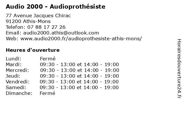 1 Lissac l'Opticien & Audioprothésiste Athis-Mons et appareils auditifs (Distance: 0,30 km) 77 Avenue Jacques Chirac, 91200 Athis-Mons appareil auditif, appareils, athis, audioprothésiste, auditifs, et, l'opticien, lentilles de contact, lissac, lissac audition, lunettes de soleil, lunettes de vue, mons, opticien, opticien lissac, prothèses auditives 2 Assu 2000 (Distance: 0,46 km) 60 Avenue François Mitterrand, 91200 Athis Mons 2000, assu, assurance, maison, moto, santé, services 3 Audio Pour Tous (Distance: 5,52 km) n/a Rue du Luxembourg, 94320 Thiais audio, audioprothésiste, audition, auditive, pour, tous, écoute 4 Audio Pour Tous (Distance: 5,65 km) 6 Rue de la Longueraie, 91270 Vigneux-sur-Seine audio, audioprothésiste, audition, auditive, pour, tous, écoute 5 Audioprothésiste Thiais - Alain Afflelou Acousticien - Closed (Distance: 5,67 km) 740 Belle Epine, 94320 Thiais acousticien, afflelou, alain, audiologie, audioprothésiste, clinique médicale, closed, thiais 6 Audioprothésiste Krys Audition (Distance: 5,67 km) Rue Du Luxembourg, 94320 Thiais audiologie, audioprothésiste, audition, krys |