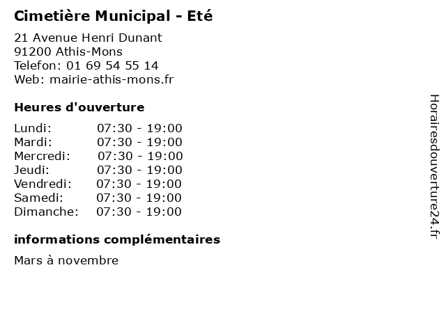 1 Cimetière Municipal - Eté (Distance: 7,44 km) 75 Rue Malleret Joinville, 94400 Vitry-sur-Seine au, avril, caveau, cimetière, d'avril, défunts, eté, funéraire, municipal, novembre, octobre, service 2 Cimetière Municipal - Eté (Distance: 7,56 km) - Allée des Tulipiers, 94450 Limeil-Brévannes cercueil, cimetiere, cimetière, deuil, eté, mort, municipal 3 Cimetière Municipal - Eté (Distance: 8,66 km) 86 rue de Châtenay, 92160 Antony cercueil, cimetiere, cimetière, deuil, eté, mort, municipal 4 Cimetière Municipal - Eté (Distance: 10,79 km) 15 avenue Paul-Vaillant Couturier, 94110 Arcueil arcueil, cercueil, cimetiere, cimetière, deuil, eté, mort, municipal 5 Cimetière Municipal - Eté (Distance: 17,73 km) - route des Huit Bouteilles, 92370 Chaville cercueil, cimetiere, cimetière, deuil, eté, mort, municipal 6 Cimetière Municipal - Hiver (Distance: 0,00 km) 21 Avenue Henri Dunant, 91200 Athis-Mons au, caveau, cimetière, de, dernier, du, défunts, funéraire, février, hiver, jour, municipal, novembre, service |