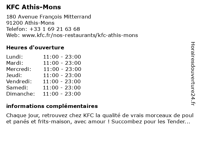 3 KFC Chilly-Mazarin (Distance: 5,12 km) 24-26 Route de Massy, 91380 Chilly-Mazarin burgers et buckets, chilly, frites, kfc, mazarin, poulet et bucket, restaurant 5 KFC Drive (Distance: 8,46 km) 20 rue de la Croix Saint Jacques, 91620 La Ville du Bois boissons, burger, drive, fastfood, frites, kfc, restaurant 6 KFC Drive (Distance: 10,82 km) . avenue des Bleuets, 94380 Bonneuil sur Marne boissons, burger, drive, fastfood, frites, kfc, restaurant |