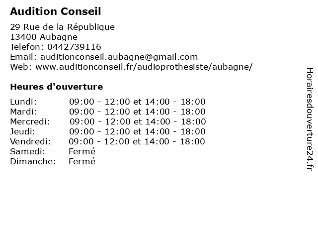 1 Audition Conseil (Distance: 9,29 km) 589 Avenue du 7ème Régiment du Tirailleur Algériens, 13190 Allauch audition, conseil 2 Audition Conseil (Distance: 11,14 km) - Zac le Pujol, 13390 Auriol aide auditive, audition, conseil, santé, spécialiste 3 Audition Conseil (Distance: 12,77 km) 93 boulevard du Cabot, 13009 Marseille aides, appareillage, appareils, auditif, audition, centre, conseil, surdite 4 Audition Conseil (Distance: 13,16 km) 83 Rue des Poilus, 13600 La Ciotat aide, audioprothésiste, audition, auditive, conseil, santé, spécialiste 6 Audition Conseil (Distance: 14,88 km) 15 Place Cadenat, 13003 Marseille aide auditive, audition, conseil, santé, spécialiste |
