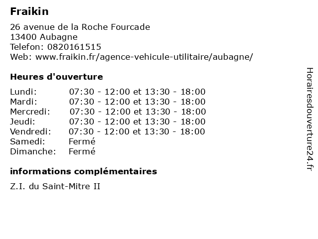 1 Fraikin (Distance: 16,95 km) 90 chemin du Ruisseau Mirabeau, 13016 Marseille fraikin, location, services, utilitaire, véhicules 3 Fraikin Marseille (Distance: 16,95 km) 90 Chemin du Ruisseau Mirabeau, 13016 Marseille fraikin, marseille 6 Fraikin (Distance: 39,42 km) 142 avenue Léo Lagrange, 83078 Toulon fraikin, location, services, utilitaire, véhicules |