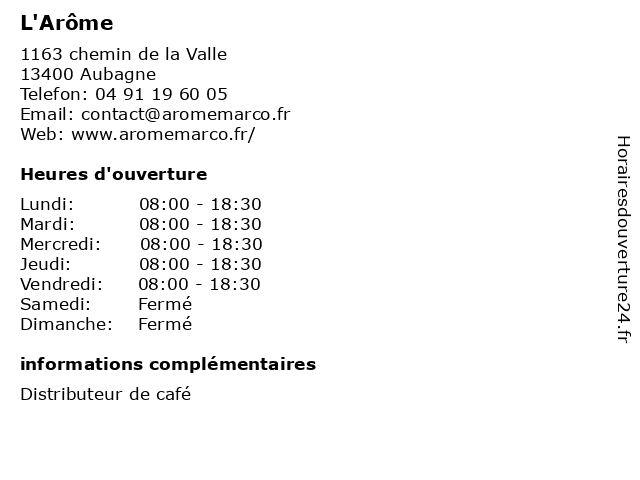1 L'Arôme (Distance: 11,87 km) 9 Rue Des 3 Rois, 13006 Marseille bar, bistro, bistrot, brasserie, café, l'arôme, restaurant, restauration 3 Segedia Services (Distance: 0,57 km) 18 Avenue de la Roche Fourcade, 13400 Aubagne automatiques, boissons, cafe, distributeurs, machine, segedia, services 4 Aubagne Machine à Coudre (Distance: 3,88 km) 12 Avenue de Verdun, 13400 Aubagne aubagne, coudre, machine 5 Francofa Eurodis (Distance: 6,42 km) 116 Boulevard de la Pomme, 13011 Marseille agences, courants, distributeurs, eurodis, faible, fournisseurs, francofa 6 |