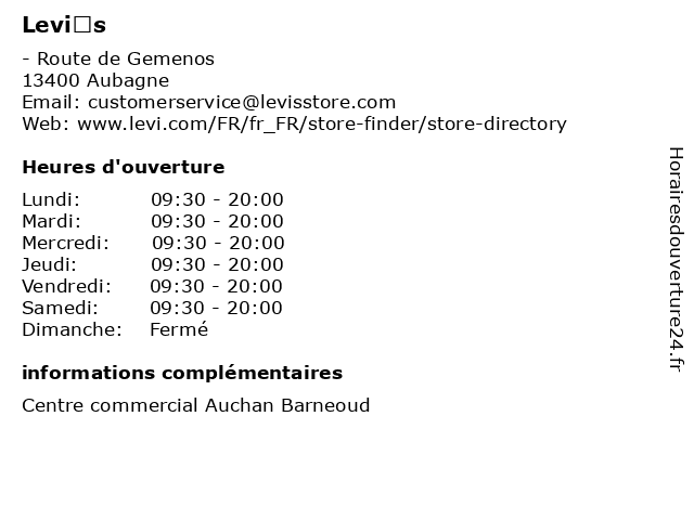 1 Levi’s Store (SAUF JUILLET/AOUT) (Distance: 27,82 km) 605 Place François Villon, 13100 Aix-en-Provence boutique de chaussures, femme, juillet/aout, levi’s, luxe homme, sauf, store 2 Levi’s Store (Distance: 27,82 km) 605 Place François Villon, 13100 Aix-en-Provence boutique de chaussures, femme, levi’s, luxe homme, store 3 Levi’s (Distance: 39,53 km) - Centre Commercial Grand Var, 83160 La Valette-du-Var accessoires, levi’s, magasin, mode, prêt à porter, vêtements 4 Levi’s (Distance: 57,14 km) - Route de la Quenouille, 13140 Miramas accessoires, levi’s, magasin, mode, prêt à porter, vêtements 5 Undiz (Distance: 0,00 km) - Route de Gemenos, 13400 Aubagne accessoires, boutique, lingeries, prêt à porter, undiz, vêtements 6 Claire's (Distance: 0,00 km) - route de Gémenos, 13400 Aubagne accessoires, barrettes, bijoux, claire's, fantaisie, maquillagas |