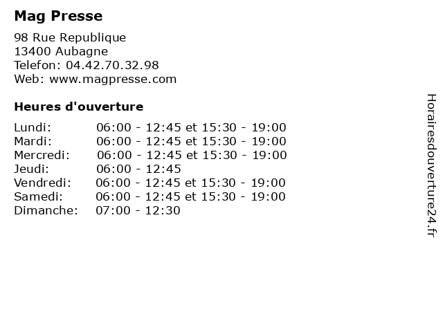 2 Mag Presse (Distance: 5,28 km) 52 Route De Cassis, 13470 Carnoux en Provence mag, magazine, presse, services 4 Mag Presse (Distance: 10,14 km) 4 Boulevard De La Valbarelle, 13011 Marseille mag, magazine, presse, services 5 Mag Presse (Distance: 13,62 km) 42 Avenue Marechal Foch, 13004 Marseille mag, magazine, presse, services 6 |