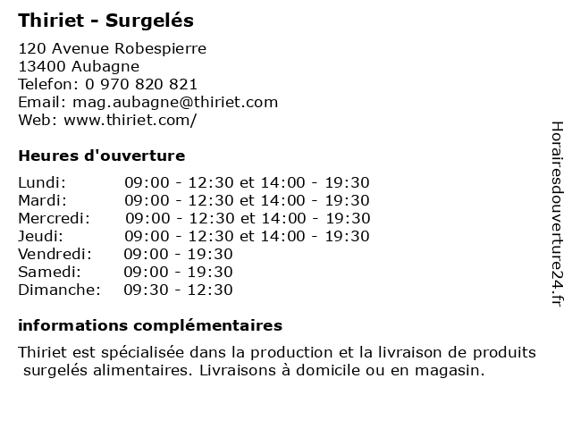 1 Thiriet - Surgelés (Distance: 8,13 km) 111 Route de Valentine, 13011 Marseille alimentaire, alimentation, courses, distributeur, livraisons, produits, supermarché, supérette, surgelés, thiriet, épicerie 2 Guillemette Thiriet - Orthoptiste (Distance: 16,57 km) 13 Boulevard Bazile Barrelier, 13014 Marseille guillemette, medecin, ortho, orthoptiste, sante, thiriet 3 CENTER MARKET (Distance: 0,83 km) 2 Avenue de Verdun, 13400 Aubagne alimentation discount, boissons, center, confiserie, espace primeur, gâteaux, hygiène et soin, market, surgelés, épicerie du monde 4 Pizzeria Le Florentin (Distance: 1,39 km) 14 Cours Maréchal Foch, 13400 Aubagne florentin, italien, le, livraisons, pizza, pizzas, pizzeria, restaurant, restauration, sur place, à emporter 5 Picard (Distance: 1,74 km) 27 Avenue des Goums, 13400 Aubagne en cuisine, la production française, les fruits, les légumes, picard, produit développé en france, société française de produits surgelés, un magasin picard 6 Kruz Seafood (Distance: 3,15 km) 170 Avenue de Passe Temps, 13400 Aubagne export, import, kruz, mer, produits, seafood, surgelés |
