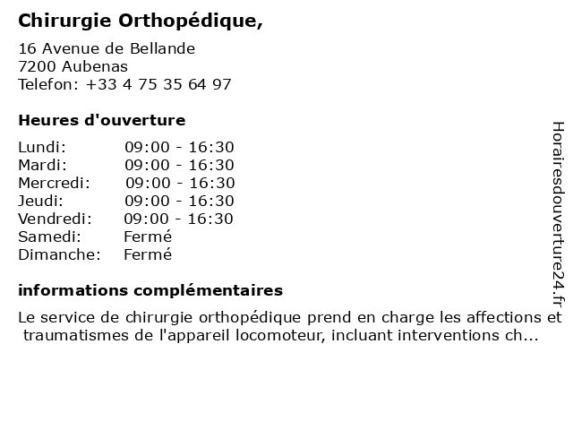 1 3 CH Ardeche meridionale - chirurgie orthopédique (Distance: 0,05 km) 14 Avenue de Bellande, 07205 Aubenas ardeche, bureau, ch, chirurgie, consultation, dr, maladie, med, meridionale, médecin, médecine, orthopédique, pratique, thérapie, traitement 4 CH de Montélimar - Chirurgie orthopédique et traumatologique - Secrétariat consultations (Distance: 29,43 km) - Route de Sauzet, 26200 Montélimar bureau, ch, chirurgie, consultation, consultations, de, dr, et, maladie, med, montélimar, médecin, médecine, orthopédique, pratique, secrétariat, thérapie, traitement, traumatologique 5 CH de Montélimar - Chirurgie orthopédique et traumatologique - Horaires de consultations (Distance: 29,43 km) - Route de Sauzet, 26200 Montélimar bureau, ch, chirurgie, consultation, consultations, de, dr, et, horaires, maladie, med, montélimar, médecin, médecine, orthopédique, pratique, thérapie, traitement, traumatologique 6 CH de Montélimar - Chirurgie orthopédique et traumatologique - Consultation post-urgence (Distance: 29,43 km) - Route de Sauzet, 26200 Montélimar bureau, ch, chirurgie, consultation, de, dr, et, maladie, med, montélimar, médecin, médecine, orthopédique, post, pratique, thérapie, traitement, traumatologique, urgence |