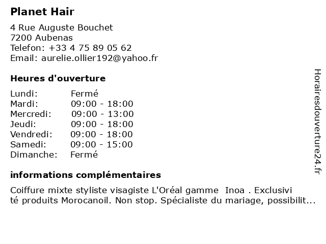 1 Un Brin d'Hair (Distance: 0,13 km) 30 Grand Rue, 07200 Aubenas beauté, brin, coiffeur, coiffure, d'hair, hair, salon, un 2 Planet Food (Distance: 0,16 km) 17 Boulevard Jean Mathon, 07200 Aubenas food, pizza, pizzeria, planet, planete, restaurants 3 HAIR LOOK CAPPY ANAIS (Distance: 11,45 km) 5 Rue Jean Louis Soulavie, 07110 Largentière anais, cappy, chignon largentière, coiffure mariage largentière, coiffure pour enfants largentière, coiffure pour femmes largentière, coiffure pour hommes largentière, coloration largentière, coupes afro largentière, hair, look, maquillage largentière, salon de coiffure largentière, tissage et extensions largentière 4 Néo Hair Studio (Distance: 11,51 km) 7 place Paul Mercier, 07110 Largentière balayage, coiffeur, coiffure, coloration, coupe, hair, mèches, néo, studio 5 Nouvel' Hair (Distance: 18,14 km) 233 rue Bragigous, 07400 Alba-la-Romaine balayage, coiffeur, coiffure, coloration, coupe, hair, mèche, nouvel', soins 6 Nocibe (Distance: 0,36 km) 2 Boulevard Saint Didier, 07200 Aubenas beauty program, care, hair, institute, make up, nocibe, nocibé, perfume, shampoo |