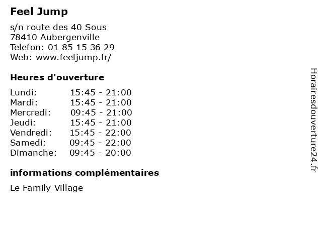 1 Feel Juice (Distance: 15,10 km) . Chambourcy, 78240 Chambourcy beaute, cafe, chaussures, enfants, feel, hommes, juice, lingerie, mode femmes, restaurant, sport 2 Fresh Time (Distance: 10,62 km) 175 Rue De l Ancienne Mairie, 78670 Villennes Sur Seine feel, fresh, restaurants, so, time 3 Urban Jump - Périodes Scolaire (Distance: 23,21 km) - rue François Cevert, 78310 Maurepas balles aux prisonniers, jump, loisirs intérieur, ninja warrior, piscine de cubes en mousse, périodes, scolaire, trampoline, urban 4 Urban Jump - Congés Scolaire hors été (Distance: 23,21 km) - rue François Cevert, 78310 Maurepas balles aux prisonniers, congés, hors, jump, loisirs intérieur, ninja warrior, piscine de cubes en mousse, scolaire, trampoline, urban, été 5 Urban Jump - Congés d'été (Distance: 23,21 km) - rue François Cevert, 78310 Maurepas balles aux prisonniers, congés, d'été, jump, loisirs intérieur, ninja warrior, piscine de cubes en mousse, trampoline, urban 6 Space Jump (Distance: 30,93 km) - route nationale 13, 27930 Guichainville jeux, jump, loisirs, parc, space, trampoline |