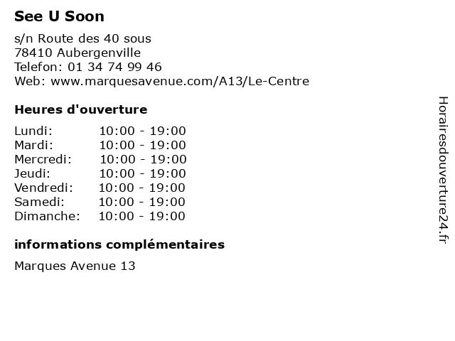 1 See U Soon (Distance: 1,26 km) - Route départementale 14, 78410 Aubergenville femme, homme, mode, see, soon 2 LPB Woman (Distance: 0,00 km) s/n Route des 40 sous, 78410 Aubergenville a13, avenue, centre, centre commercial, commercial, lpb, marques, shopping, sport, woman 3 Redskins (Distance: 0,00 km) s/n Route des 40 sous, 78410 Aubergenville centre commercial, cuir, la mode, redskins, shopping, vêtements 4 Bébé Confort (Distance: 0,00 km) s/n Route des 40 sous, 78410 Aubergenville accessoires, bébé, centre commercial, confort, shopping, textils 5 Izac (Distance: 0,00 km) s/n Route des 40 sous, 78410 Aubergenville centre commercial, homme, izac, la mode, shopping, vêtements 6 Benetton (Distance: 0,51 km) - A13, 78410 Aubergenville beauté, benetton, boutiques, déco, enfants, mode, mode femme, shopping |