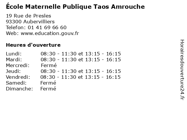 1 École maternelle publique Taos Amrouche (Distance: 0,96 km) 1 Avenue Henri Barbusse, 93300 Aubervilliers amrouche, ecole, education, maternelle, publique, services, taos, école 2 Ecole Elementaire Publique Taos Amrouche (Distance: 2,19 km) 12 mail des Maraîchers, 93200 Saint-Denis amrouche, cours, ecole, education, elementaire, publique, services, taos, école, élémentaire 4 Maître Myriam Amrouche - Avocate (Distance: 4,93 km) 55 Boulevard De Strasbourg, 75010 Paris amrouche, avocate, avocats, cabinet, conseils, contentieux, juridique, justice, litiges, maître, myriam, services 5 Maître Ouerdia Amrouche - Avocate (Distance: 8,20 km) 66 avenue Marceau, 75008 Paris amrouche, avocat, avocate, droit, maître, négociation, ouerdia 6 École primaire publique - Aubervilliers (Distance: 0,00 km) 19 Rue de Presles, 93300 Aubervilliers aubervilliers, ecole, education, maternelle, primaire, publique, services, école |