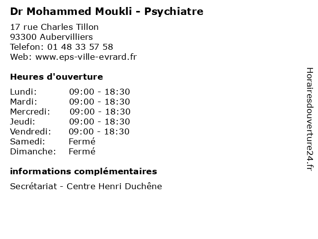 1 Dr Mohammed Moukli - Psychiatre (Distance: 8,99 km) 55 Rue du Commandant René Mouchotte, 94160 Saint-Mandé dr, mohammed, moukli, psy, psychiatre, sante, soins 2 Dr Martine Assouly - Psychiatre (Distance: 0,00 km) 17 rue Charles Tillon, 93300 Aubervilliers assouly, consultation, docteur, dr, martine, med, medecine, medical, médecin, psychiatre, traitement 3 Dr Emmanouel Kosadinos - Psychiatre (Distance: 0,00 km) 17 rue Charles Tillon, 93300 Aubervilliers consultation, docteur, dr, emmanouel, kosadinos, med, medecine, medical, médecin, psychiatre, traitement 4 Dr Marina Rymar - Psychiatre (Distance: 0,00 km) 17 rue Charles Tillon, 93300 Aubervilliers consultation, docteur, dr, marina, med, medecine, medical, médecin, psychiatre, rymar, traitement 5 Dr Mohamed Ben Nefissa - Psychiatre (Distance: 1,40 km) 1 Cour des Maraîchers, 93120 La Courneuve ben, cabinet, consultation, dr, mohamed, nefissa, psychiatre, psychiatrie 6 Dr Taoufik Souaia - Psychiatre (Distance: 3,65 km) 17 Avenue Henri Barbusse, 93700 Drancy consultation, docteur, dr, médecin, psychiatre, souaia, taoufik |