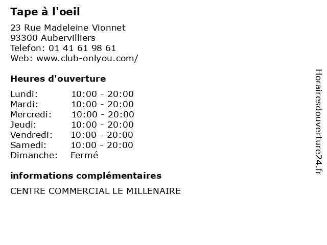 1 Tape à L'Oeil (Distance: 4,30 km) 4 Boulevard Gallieni, 92390 Villeneuve-la-Garenne accessoires, enfants, habillement, l'oeil, mode, nourrisson, tape, vêtements 2 Tape à l'oeil (Distance: 6,38 km) 31 rue du Président Wilson, 92300 Levallois-Perret bébé, enfant, habillement, l'oeil, magasin, mode, tape 3 Tape à l'Oeil (Distance: 6,90 km) 82 avenue des Ternes, 75017 Paris bébé, enfant, habillement, l'oeil, magasin, mode, tape 4 Tape à L'oeil (Distance: 8,56 km) 200 Avenue de la Division Leclerc, 95200 Sarcelles centre, commercial, l'oeil, my, place, sarcelles, tape 5 Tape à l'Oeil (Distance: 12,20 km) 134 avenue de la plaine de France, 95500 Gonesse bébé, enfant, habillement, l'oeil, magasin, mode, tape 6 Tape à l'Oeil (Distance: 17,37 km) 5-11 avenue des Roses, 94380 Bonneuil-sur-Marne bébé, enfant, habillement, l'oeil, magasin, mode, tape |
