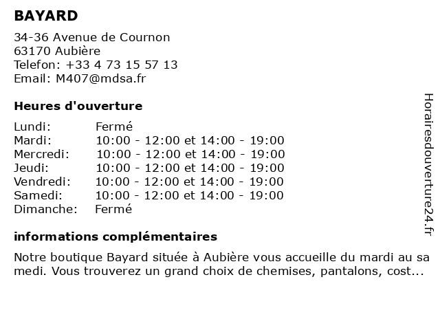 Notre boutique Bayard située à Aubière vous accueille du mardi au samedi. Vous trouverez un grand choix de chemises, pantalons, costumes, pulls, polos. Casual ou formel, tous les styles sont rep...