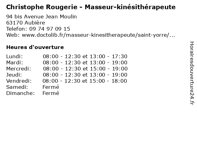 | Jeudi | 08:00-12:30 et 13:00-19:00 |