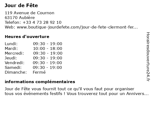 1 Jour De Fete (Distance: 0,13 km) 106 Avenue Ernest Cristal, 63170 Aubière accessoires, cadeaux, de, deco, fete, jour, kids 2 Etoile d'Un Jour (Distance: 0,83 km) 52 Avenue de Cournon, 63170 Aubière boutique, cocktail, cérémonie, d'un, etoile, jour, mariage, mariée, robes 3 Jour de Fête - Drive & Siège Social (Distance: 2,10 km) 5 Rue de Pérignat, 63800 Cournon d'Auvergne accessoires, de, drive, décoration, déguisement, fête, jour, siège, social, vaisselle, équipement 4 Patinoire - Vacances scolaires de Février - Horaire de jour (Distance: 2,76 km) 155 Boulevard Gustave Flaubert, 63000 Clermont Ferrand de, famille, février, glace, glisse, horaire, jour, loisirs, patin, patinoire, scolaires, sport, vacances 5 Théatre Jour Et Nuit (Distance: 5,58 km) 6 Rue des 2 Marchés, 63000 Clermont-Ferrand et, jour, nuit, théatre 6 Un Jour Ailleurs (Distance: 5,67 km) 5 Rue du Maréchal Foch, 63000 Clermont Ferrand accessoires, ailleurs, jour, mode, un, vetements |