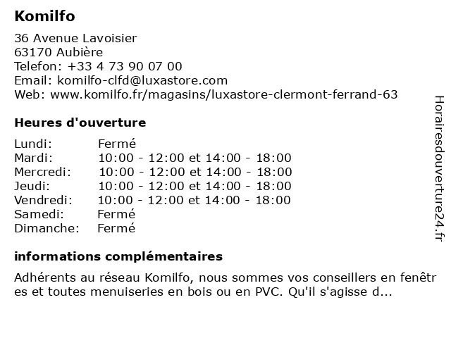 1 Komilfo (Distance: 0,42 km) 19 Rue Ernest Cristal, 63100 Clermont Ferrand fenetre, komilfo, pergolas, portails, stores exterieurs, volets roulants 2 KOMILFO Luxastore Déco Adhérent indépendant (Distance: 0,44 km) Avenue Ernest Cristal, 63000 Clermont-Ferrand adhérent, déco, indépendant, komilfo, luxastore 3 |