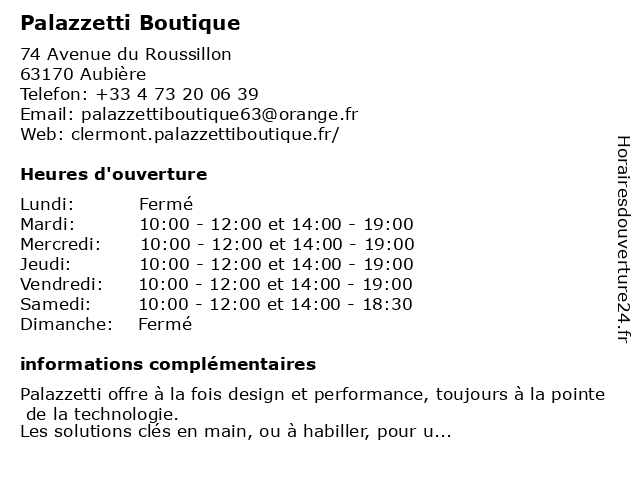 | Samedi | 10:00-12:00 et 14:00-18:30 |