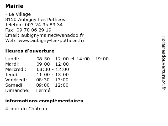 4 Mairie (Distance: 11,11 km) 28 place de la Mairie, 08260 Auvillers-les-Forges administration, mairie, public, service 5 6 |