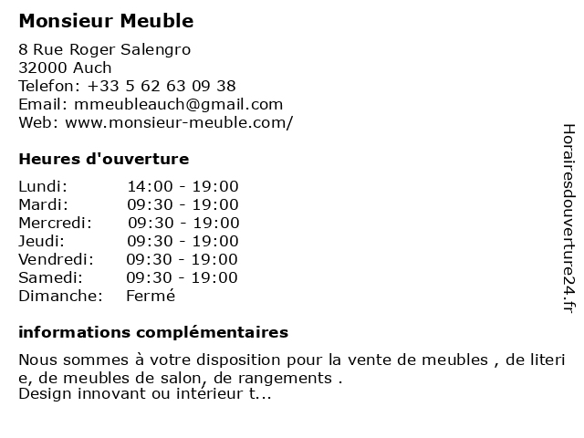 | 1 Monsieur Gabriel Bourzat (Distance: 2,02 km) Chemin Des Arrouilleres, 32000 Auch bourzat, gabriel, restaurants 2 3 Bagi Meuble (Distance: 6,50 km) - ZI au Sousson, 32550 Pavie bagi, canapé, canapés, magasin de canapés, meuble, meubles 4 Centrakor (Distance: 39,11 km) . Rue Pont Peyrin, 32600 L'isle Jourdain bain et beaute, centrakor, deco, meuble, table 5 Monsieur Meuble (Distance: 56,56 km) - ZAC de Gardes, 47550 Boe ameublement, meuble, meubles, monsieur, salon, équipement maison 6 Casa (Distance: 56,67 km) 2 Allée Joseph Lacroix, 47550 Boe accessoires, casa, décoration, loisirs créatifs, meuble |
