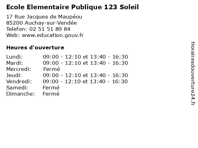 1 Ecole Maternelle Publique 123 Soleil (Distance: 0,00 km) 17 Rue Jacques de Maupéou, 85200 Auchay-sur-Vendée 123, cours, ecole, education, maternelle, publique, services, soleil, école 2 Ecole Elementaire Publique Magellan (Distance: 1,27 km) 23 Route des Fontaines, 85200 Auchay-sur-Vendée cours, ecole, education, elementaire, magellan, publique, services, école, élémentaire 3 École Elementaire Publique Benjamin Julien Garos (Distance: 4,13 km) 9 Place de la Mairie Fontaines, 85200 Doix lès Fontaines benjamin, cours, education, elementaire, garos, julien, publique, services, École, école, élémentaire 4 École Elementaire Publique René Jaulin (Distance: 4,34 km) 97 Rue Villa de la Gallo Romaine, 85200 Fontenay-le-Comte cours, education, elementaire, jaulin, publique, rené, services, École, école, élémentaire 5 École Elementaire Publique les Cordeliers (Distance: 5,34 km) 6 Rue Collardeau, 85200 Fontenay-le-Comte cordeliers, cours, education, elementaire, les, publique, services, École, école, élémentaire 6 École Elementaire Publique Florence Arthaud (Distance: 5,68 km) . Rue de la Croix du Camp, 85200 Fontenay-le-Comte arthaud, cours, education, elementaire, florence, publique, services, École, école, élémentaire |