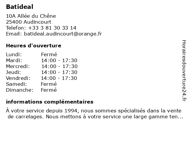 1 Batideal (Distance: 0,33 km) 10 Allée des chênes Z.I des arbletiers, 25400 Audincourt accessoires de salles de bains, batideal, carrelages, meubles, parquets |