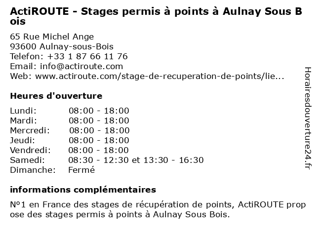 | Samedi | 08:30-12:30 et 13:30-16:30 |