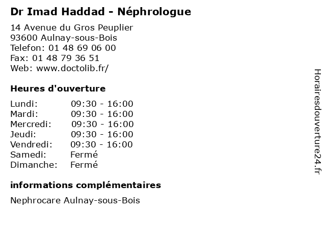 1 Dr Imad Haddad - Néphrologue (Distance: 4,19 km) 71T Boulevard du Midi, 93340 Le Raincy dr, haddad, imad, médecin, médecine, médical, néphrologue, pharmaceutique, traitement 2 Dr Sébastien Homs - Néphrologue (Distance: 0,15 km) 30 Avenue du Quatorze Juillet, 93600 Aulnay-sous-Bois cerveau, dr, homs, nerf, neurologie, neurologue, néphrologue, sébastien 3 Dr Morgane Commereuc - Néphrologue (Distance: 0,15 km) 30 Avenue du Quatorze Juillet, 93600 Aulnay-sous-Bois commereuc, dr, medecin, morgane, nephrologue, néphrologue, sante, soins 4 Dr Eric Gauthier - Néphrologue (Distance: 0,19 km) 30 Avenue du Quatorze Juillet, 93600 Aulnay-sous-Bois docteur, dr, eric, gauthier, médecin, nephrologie, nephrologue, néphrologue 5 Dr Antoine Lacaille - Néphrologue (Distance: 0,19 km) 30 Avenue du Quatorze Juillet, 93600 Aulnay-sous-Bois antoine, docteur, dr, lacaille, médecin, nephrologie, nephrologue, néphrologue 6 Boulangerie Haddad (Distance: 0,59 km) 53bis Allée Circulaire, 93600 Aulnay-sous-Bois boulangerie, croissant, gâteaux, haddad, pain |