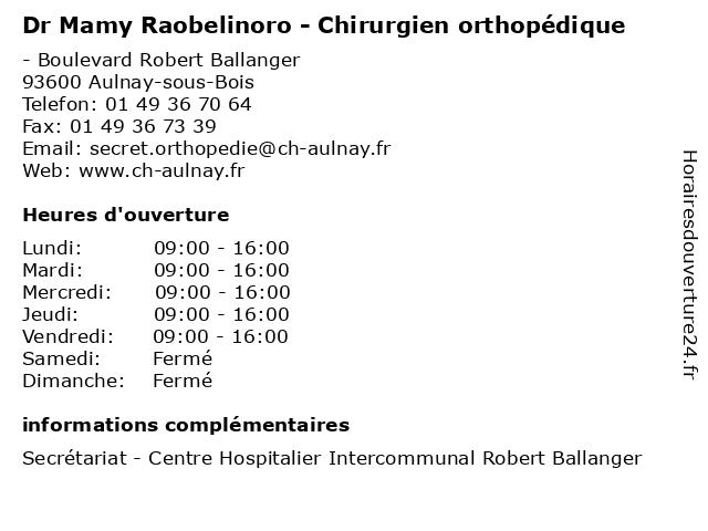 | 1 Dr Mamy Rakotonarivo - Chirurgien orthopédique (Distance: 0,00 km) - Boulevard Robert Ballanger, 93600 Aulnay-sous-Bois ballanger, centre, chirurgie, chirurgien, dr, hospitalier, intercommunal, mamy, orthopedie, orthopédique, rakotonarivo, robert, trauma, traumatologie, traumatologique 2 Dr Laurent Mamy - Gynécologue obstétricien (Distance: 14,59 km) 3-5 Avenue Watteau, 94130 Nogent-sur-Marne consultation, docteur, dr, gynécologue, laurent, mamy, med, médecin, obstétricien, traitement 3 Pascale Mamy (Distance: 15,24 km) 1 Boulevard de Belleville, 75011 Paris mamy, pascale, psychanalyse paris, psychanalyse paris 11ème, psychanalyste paris, psychanalyste paris 11ème 5 Mamy Thérèse (Distance: 17,16 km) 19 Rue Saint Antoine, 75004 Paris lorraine, mamy, moulins, restaurants, seine, thérèse 6 Dr Laurent Mamy - Gynécologue obstétricien - secrétariat (Distance: 17,43 km) 31 Avenue Foch, 94100 Saint-Maur-des-Fossés consultation, docteur, dr, gynécologue, laurent, mamy, med, médecin, médecine, obstétricien, secrétariat, traitement |