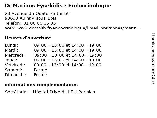1 Dr Marinos Fysekidis - Endocrinologue (Distance: 16,43 km) 56 Avenue Kléber, 75116 Paris dr, endo, endocrinologue, fysekidis, marinos, sante, soins 2 Dr Yahya Jaber - Endocrinologue (Distance: 0,08 km) 11 Avenue de la République, 93600 Aulnay-sous-Bois dr, endocrinologue, jaber, médecins, santé, spécialiste, yahya 3 Dr Camille Cussac Pillegand - Endocrinologue (Distance: 1,39 km) - Avenue du Docteur Schaffner, 93270 Sevran camille, cussac, dr, endocrinologue, médecins, médicaments, pillegand, santé, secrétariat, spécialiste 4 Dr Muriel Sitbon - Endocrinologue (Distance: 1,79 km) - Avenue du 14 Juillet, 93140 Bondy dr, endocrinologue, muriel, médecins, médicaments, santé, secrétariat, sitbon, spécialiste 5 Dr Camille Cussac Pillegand - Endocrinologue (Distance: 1,79 km) - Avenue du 14 Juillet, 93140 Bondy camille, cussac, dr, endocrinologue, médecins, médicaments, pillegand, santé, secrétariat, spécialiste 6 Dr Laurence Vittaz - Endocrinologue - secrétariat (Distance: 2,38 km) 66 Avenue de la République, 93150 Le Blanc-Mesnil consultation, docteur, dr, endocrinologue, laurence, med, médecin, médecine, secrétariat, traitement, vittaz |