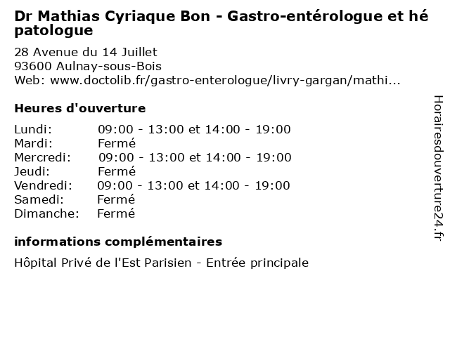 1 Dr Mathias Cyriaque Bon - Gastro-entérologue et hépatologue (Distance: 2,47 km) 135 Avenue Vauban, 93190 Livry-Gargan bon, consultation, cyriaque, docteur, dr, entérologue, et, gastro, hépatologue, mathias, med, médecin, médecine, secrétariat, traitement 2 Dr Mathias Cyriaque Bon - Gastro-entérologue et hépatologue (Distance: 7,23 km) 40 rue Floréal, 93170 Bagnolet bon, consultation, cyriaque, docteur, dr, entérologue, et, gastro, hépatologue, mathias, med, médecin, traitement 3 Medecin Thierry Garnier (hépatologue) (Distance: 0,22 km) 28 Avenue du 14 juillet, 93600 Aulnay-sous-Bois docteur, garnier, hépatologue, medecin, sante, services, thierry 4 Dr Gilles Minier - Gastro-entérologue et hépatologue (Distance: 0,22 km) 28 Avenue du 14 juillet, 93600 Aulnay-sous-Bois docteur, dr, entérologue, et, gastro, gilles, hépatologue, medecin, minier, sante, services 5 Au Bon Fournil (Distance: 0,78 km) 1 Rue Du Havre, 93600 Aulnay Sous Bois artisan, au, bon, boulanger, boulangerie, fournil, patisserie, patissier, sandwicherie 6 Dr Anne Bruhat - Gastro-entérologue et hépatologue (Distance: 1,58 km) - Avenue du Docteur Schaeffner, 93270 Sevran anne, bruhat, consultation, docteur, dr, entérologue, et, gastro, hépatologue, med, médecin, traitement |