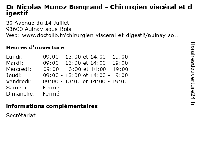 1 Dr Nicolas Munoz Bongrand - Chirurgien viscéral et digestif (Distance: 10,80 km) 3 Avenue Watteau, 94130 Nogent-sur-Marne armand, bongrand, brillard, chirurgien, de, digestif, docteur, dr, et, generaliste, générale, hôpital, medical, munoz, nicolas, privé, ramsay, santé, soin, viscéral 2 Dr Eric Descamps - Chirurgien viscéral et digestif (Distance: 0,00 km) 30 Avenue du 14 Juillet, 93600 Aulnay-sous-Bois chirurgien, descamps, digestif, docteur, dr, eric, et, sante, soins, viscéral 3 Dr Giulia Boarini - Chirurgien viscéral et digestif (Distance: 1,77 km) - Avenue du 14 Juillet, 93140 Bondy boarini, chirurgien, digestif, dr, et, giulia, médecins, médicaments, santé, secrétariat, spécialiste, viscéral 4 Dr Corinne Vons - Chirurgien viscéral et digestif (Distance: 1,77 km) - Avenue du 14 Juillet, 93140 Bondy chirurgien, corinne, digestif, dr, et, médecins, médicaments, santé, secrétariat, spécialiste, viscéral, vons 5 Dr Denis Blazquez - Chirurgien viscéral et digestif (Distance: 1,97 km) - Avenue du 14 Juillet, 93140 Bondy blazquez, chirurgien, denis, digestif, docteur, dr, et, médecin, viscéral 6 Dr Alcide Philippe Thognon - Chirurgien viscéral et digestif - secrétariat (Distance: 2,25 km) 135 Avenue Vauban, 93190 Livry-Gargan alcide, chirurgien, consultation, digestif, docteur, dr, et, med, médecin, médecine, philippe, secrétariat, thognon, traitement, viscéral |