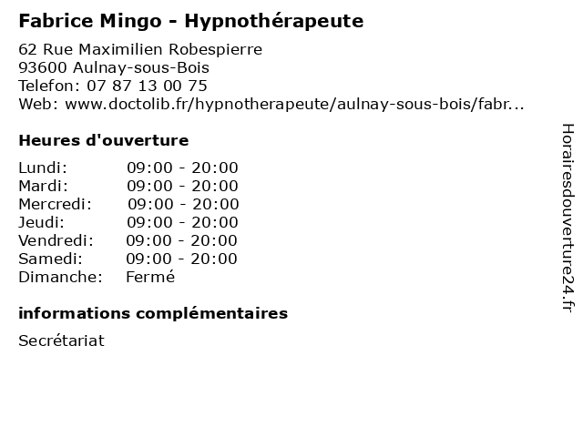 1 Fabrice Mingo - Hypnothérapeute (Distance: 7,27 km) 3 Place Pasteur, 77290 Mitry-Mory fabrice, hypno, hypnose, hypnothérapeute, mingo, sante 2 Séverine Vernat - Hypnothérapeute (Distance: 1,81 km) 12 Avenue du Clocher, 93600 Aulnay-sous-Bois hypno, hypnose, hypnothérapeute, sante, severine, séverine, vernat 3 Yanis Belqasmi - Hypnothérapeute (Distance: 6,51 km) 114 Avenue Franklin Roosevelt, 77290 Mitry-Mory belqasmi, hypno, hypnose, hypnothérapeute, sante, yanis 4 Anissa Fouchard - Hypnothérapeute (Distance: 8,47 km) - Impasse des Châtaigniers, 77270 Villeparisis anissa, fouchard, hypno, hypnose, hypnothérapeute, sante 5 Carine Level - Psychopraticienne et hypnothérapeute à Chelles (Distance: 9,92 km) 29 Avenue Martyrs de Chelles, 77500 Chelles bureau, carine, chelles, consultation, dr, et, hypnothérapeute, level, maladie, med, médecin, médecine, pratique, psychopraticienne, thérapie, traitement 6 Hypnothérapeute (Vuilleumier Nadine) (Distance: 11,59 km) 25 rue Pradier, 75019 Paris hypnothérapeute, hypnothérapie, nadine, sophrologie, vuilleumier |