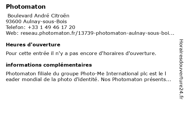 1 Photomaton (Distance: 0,04 km) Boulevard André Citroën, 93600 Aulnay-sous-Bois photomaton