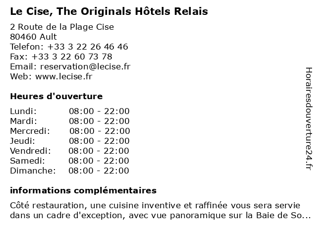 1 Le Cise, The Originals Relais (Relais du Silence) (Distance: 0,00 km) Route de la Plage Cise, 80460 Ault cise, du, hôtel, le, originals, relais, restaurant, silence, séminaire, the, tourisme 2 Relais du Silence - Hôtel Le Cise (Accès) (Distance: 0,10 km) - Route de la Plage, 80460 Ault accès, cise, du, hebergement, hotel, hôtel, le, relais, silence, tourisme 3 The Originals Boutique, Hôtel La Villa Marine, Le Tréport (Distance: 4,50 km) 1 Place Pierre Semard, 76470 Le Tréport boutique, hôtel, la, le, marine, originals, the, tourisme, tréport, villa 4 The Originals City, Hôtel La Cour Carrée, Eu (Inter-Hotel) (Distance: 6,32 km) Rue de Dieppe, 76260 Eu carrée, city, cour, eu, hotel, hôtel, inter, la, originals, restaurant, the, tourisme 5 The Originals Boutique, Hôtel La Colonne de Bronze, Saint-Valéry-sur-Somme (Inter-Hotel) (Distance: 18,48 km) 43 Quai du Romerel, 80230 Saint-Valery-sur-Somme boutique, bronze, colonne, de, hotel, hôtel, inter, la, originals, saint, somme, sur, séminaire, the, tourisme, valéry 6 The Foam-Blue (Distance: 18,95 km) 30 Rue De La Ferte, 80230 St Valery Sur Somme blue, foam, restaurants, the |