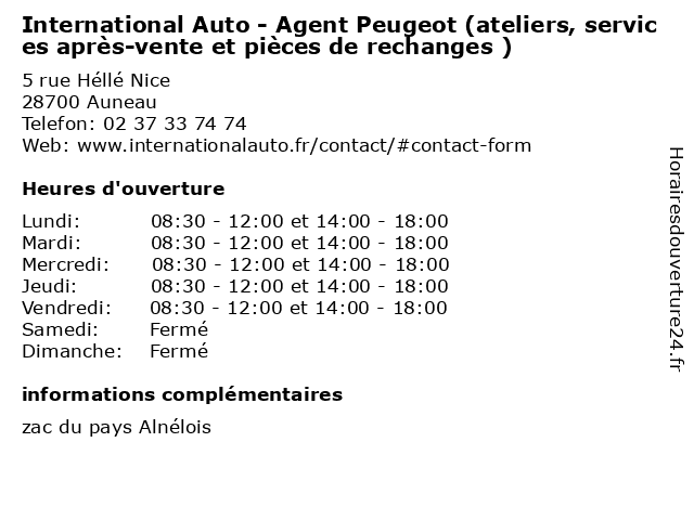1 International Auto - Agent Peugeot (Distance: 0,00 km) 5 rue Héllé Nice, 28700 Auneau agent, auto, automobiles, international, magasins, neuf, occassion, peugeot 2 MMA EIRL Emmanuel Gauthier Agent Général Exclusif (Distance: 1,50 km) 27 Rue Pasteur, 28700 Auneau-Bleury-Saint-Symphorien agent, eirl, emmanuel, exclusif, gauthier, général, mma 3 Peugeot (Distance: 4,59 km) 46 Rue De Gallardon, 28700 Auneau automobiles, concéssionnaire, garage, motos, peugeot 4 Renault - Après vente (Distance: 14,42 km) . Avenue de l'Europe, 28230 Epernon après, atelier, automobile, concessionnaire, garage, neuve, occasion, renault, réparation, vente 5 Renault - Vente (Distance: 14,42 km) . Avenue de l'Europe, 28230 Epernon atelier, automobile, concessionnaire, garage, neuve, occasion, renault, réparation, vente 6 Citroën L'Hermite Automobiles Chartres sa (Après Vente) (Distance: 16,36 km) 9 rue Gilles de Roberval, 28630 Nogent le Phaye apres, après, automobiles, chartres, citroën, l'hermite, lhermite, sa, services, vente, véhicules |