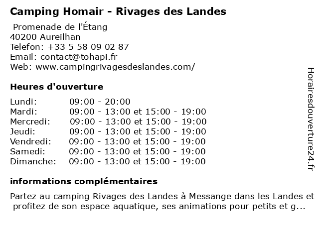 1 Camping Domaine d'Eurolac - Tohapi (Réception, haute saison) (Distance: 0,26 km) - Promenade de l'Etang, 40200 Aureilhan camping, d'eurolac, domaine, haute, hebergement, réception, saison, tohapi, tourisme 2 Camping Domaine d'Eurolac - Tohapi (Réception, basse saison) (Distance: 0,26 km) - Promenade de l'Etang, 40200 Aureilhan basse, camping, d'eurolac, domaine, hebergement, réception, saison, tohapi, tourisme 3 Camping Tohapi Aurilandes (Distance: 0,73 km) 1001 Promenade de l'Étang, 40200 Aureilhan aurilandes, camping, camping 3 étoiles, camping 3 étoiles aquitaine, camping 3 étoiles sud le france, camping 3 étoiles sud ouest, camping animations, camping aquitaine, camping aquitaine avec piscine, camping avec étang de pêche et piscine, camping bord de mer atlantique, camping club enfants, camping dans les landes avec piscine, camping famille, camping landes, camping landes bord de mer, camping piscine, camping pêche, camping sud de la france, camping sud ouest, location de mobil-home, tohapi 4 Camping Aurilandes - Tohapi (Réception, haute saison) (Distance: 0,83 km) 1001 Promenade de l’Étang, 40200 Aureilhan aurilandes, camping, haute, hebergement, réception, saison, tohapi, tourisme 5 Camping Aurilandes - Tohapi (Réception, basse saison) (Distance: 0,83 km) 1001 Promenade de l’Étang, 40200 Aureilhan aurilandes, basse, camping, hebergement, réception, saison, tohapi, tourisme 6 Camping Les Landes Bleues (Distance: 1,58 km) 295 Route de Castelnau, 40200 Aureilhan bleues, camping, landes, les |