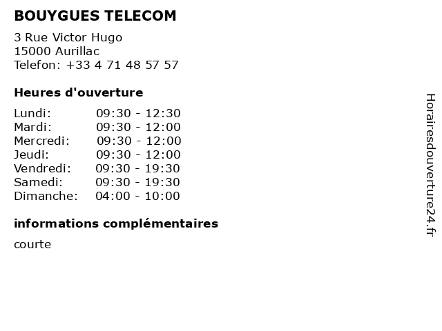 1 BOUYGUES TELECOM (Distance: 0,01 km) 87 Avenue Charles de Gaulle, 15000 Aurillac bouygues, fai, fournisseur d'accès internet, telecom, téléphonie mobile 2 BOUYGUES TELECOM (Distance: 2,88 km) 87 Avenue Charles de Gaulle, 15000 Aurillac bouygues, clef, telecom 3 Destruels Bouygues Ets (Distance: 16,36 km) 2B Rue des Écoles, 15290 Le Rouget-Pers bouygues, destruels, ets 4 Welcom | Téléphone, reconditionné, réparation, forfait, box internet (Distance: 0,00 km) 87 Avenue Charles de Gaulle, 15000 Aurillac accessoires, bouygues telecom, box, box internet, box internet fibre, coriolis télécom, diagnostic téléphone, forfait, forfait mobile, internet, objets connectés, occasion, reconditionné, reconditionnés, reprise de téléphone, reprise iphone, revendez votre téléphone actuel, réparation, réparation téléphone, téléphone, téléphones neufs, téléphonie mobile, vendre son ancien téléphone, welcom, éligibilité à la fibre 5 Destruels-Bouygues ETS (Distance: 27,67 km) 9 Avenue d'Aurillac, 15600 Saint-Étienne-de-Maurs bouygues, destruels, ets 6 |