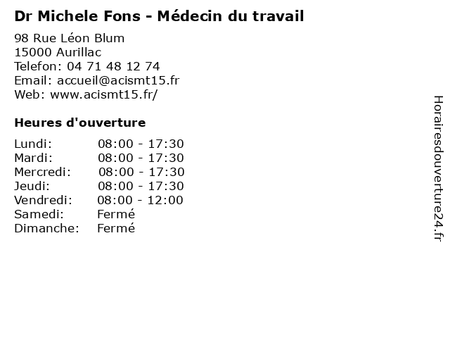 1 Dr Fabienne Penez-Clouet - Médecin du travail (Distance: 0,00 km) 98 Rue Léon Blum, 15000 Aurillac clouet, consultation, docteur, dr, du, fabienne, med, médecin, penez, traitement, travail 2 Dr Pierre Taule - Médecin du travail (Distance: 0,00 km) 98 Rue Léon Blum, 15000 Aurillac consultation, docteur, dr, du, med, médecin, pierre, taule, traitement, travail 3 ACISMT - Service de Santé au Travail du Cantal (Distance: 0,00 km) 98 Rue Léon Blum, 15000 Aurillac acismt, au, aurillac, cantal, de, du, santé, service, travail 4 Dr Michele Threil - Ophtalmologue (Distance: 0,71 km) 83 Avenue Charles de Gaulle, 15000 Aurillac consultation, docteur, dr, med, michele, médecin, médecine, ophtalmologue, threil, traitement 5 Direction départementale de l'emploi, du travail, des solidarités et de la protection des populations (DDETSPP) (Distance: 2,10 km) 1 rue de l'Olmet, 15000 Aurillac administration, assoc, cohésion, ddcspp, ddetspp, de, des, direction, du, départementale, et, l'emploi, la, populations, protection, services, services publics, sociale, solidarités, travail 6 Caldamaison Cecile Michele (Distance: 2,25 km) 38 Rue Felix Ramond, 15130 Arpajon Sur Cere caldamaison, cecile, michele, restaurants |