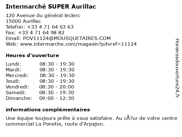 1 Intermarché SUPER Aurillac (Distance: 1,30 km) 66 Rue de firminy, 15000 Aurillac aurillac, intermarché, super 2 Intermarché station-service Aurillac (Distance: 0,00 km) 120 Avenue du général leclerc, 15000 Aurillac aurillac, intermarché, service, station 3 Intermarché station-service Aurillac (Distance: 0,03 km) 120 Avenue du Général Leclerc, 15000 Aurillac aurillac, intermarché, service, station 4 Intermarché station-service Aurillac (Distance: 1,30 km) 66 Rue de firminy, 15000 Aurillac aurillac, intermarché, service, station 5 Intermarché station-service Aurillac (Distance: 1,33 km) 66 Rue de Firminy, 15000 Aurillac aurillac, intermarché, service, station 6 Intermarché SUPER Vic Sur Cere (Distance: 14,17 km) Za de comblat, 15800 Vic Sur Cere cere, intermarché, super, sur, vic |