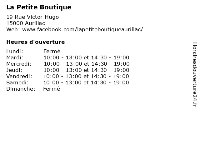 | Samedi | 10:00-13:00 et 14:30-19:00 |