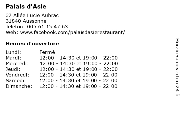 | Mardi | 12:00-14:30 et 19:00-22:00 |