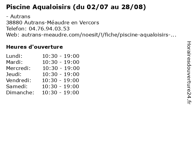 Termes de recherche pour Piscine Aqualoisirs (du 02/07 au 28/08):du, au, piscine, aqua, 28/08, aquatique, aqualoisirs, 02/07 |