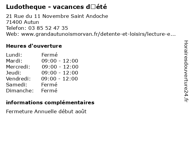 1 Ludotheque (Distance: nan km) 21 Rue du 11 Novembre Saint Andoche, 71400 Autun hors, jeux d’assemblage, jeux d’exercices, jeux symbolique, ludotheque, scolaires, vacances 2 Ludotheque - vacances scolaires (Distance: nan km) 21 Rue du 11 Novembre Saint Andoche, 71400 Autun jeux d’assemblage, jeux d’exercices, jeux symbolique, ludotheque, scolaires, vacances 3 Piscine du Parc au Creusot - Vacances scolaires (Distance: 19,49 km) - Promenade du Midi, 71200 Le Creusot aqua, aquatique, au, creusot, du, parc, piscine, scolaires, vacances 4 Maison de La Presse (Distance: 26,19 km) 70 Avenue De La Republique, 71210 Montchanin cadeaux, carterie, confiserie-boissons-food, de, française des jeux, la, librairie, maison, papeterie, pmu, presse, tabac 5 Maison de La Presse (Distance: 32,63 km) 15 Place Du Marechal Foch -, 76430 St romain cadeaux, carterie, confiserie-boissons-food, de, française des jeux, la, librairie, maison, papeterie, pmu, presse, tabac 6 Maison de La Presse (Distance: 36,77 km) 1- 3 RueDu Marche, 21210 Saulieu cadeaux, carterie, confiserie-boissons-food, de, française des jeux, la, librairie, maison, papeterie, pmu, presse, tabac |