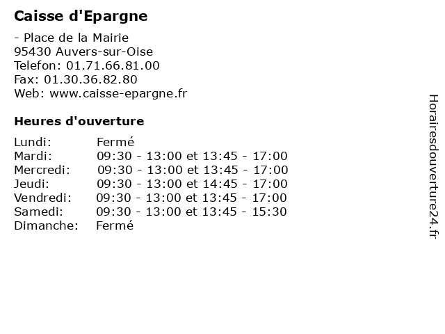 1 Caisse d'Epargne (Distance: 6,04 km) 57-59 Rue de Gisors, 95300 Pontoise banque, caisse, carte, d'epargne, services 2 Caisse d'Epargne (Distance: 6,09 km) 56 Avenue de la Gare, 95150 Taverny banque, caisse, carte, d'epargne, services 3 Caisse d'Epargne (Distance: 6,97 km) 155 Chaussée Jules César, 95250 Beauchamp banque, caisse, carte, d'epargne, d'épargne, services 4 Caisse d'Epargne (Distance: 8,23 km) 42 Rue Aristide Briand, 95520 Osny banque, caisse, carte, d'epargne, services 5 Caisse d'Epargne (Distance: 8,61 km) - Avenue Aristide Maillol, 95370 Montigny-lès-Cormeilles banque, caisse, crédit, d'epargne, épargne 6 Caisse d'Epargne (Distance: 8,74 km) . Place de la Halle, 95220 Herblay banque, caisse, carte, d'epargne, services |